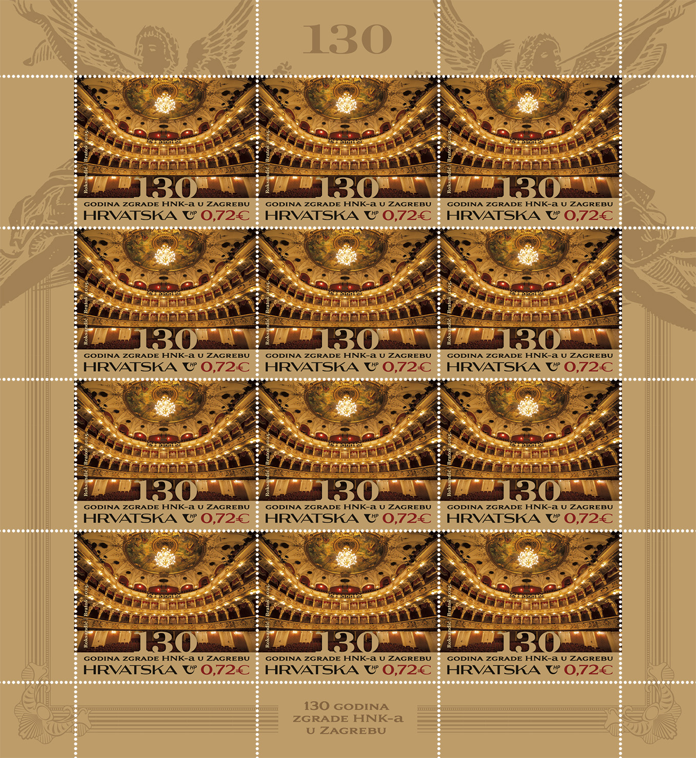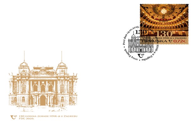 Hrvatska pošta stavit će u optjecaj 14.listopada novu prigodnu poštansku marku u povodu 130. obljetnice zgrade Hrvatskoga narodnog kazališta u Zagrebu, jednog od najvažnijih simbola hrvatske kulture i umjetnosti. Nominalna vrijednost marke iznosi 0,72 eura, a autor dizajna je Dean Roksandić, dizajner iz Zagreba. Na marki je prikazana dojmljiva unutrašnjost Hrvatskoga narodnog kazališta, prema fotografiji Mare Bratoš, fotografkinje iz Dubrovnika.